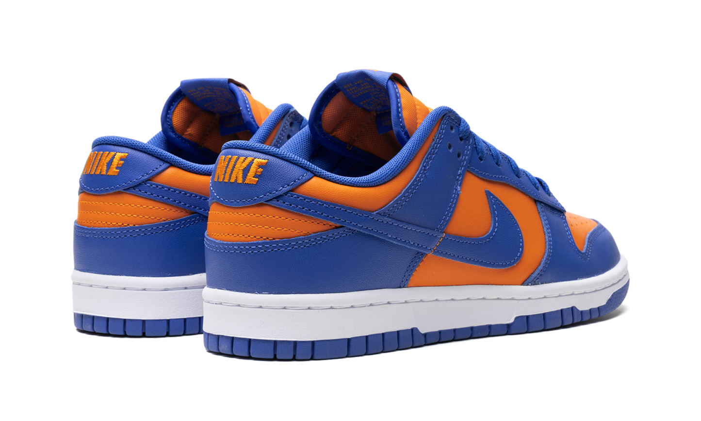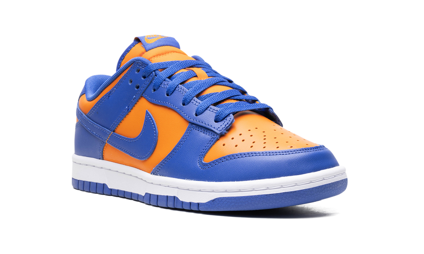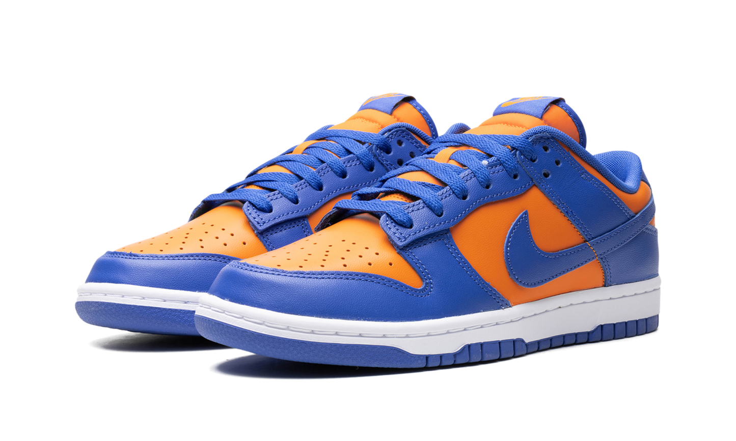 Nike Dunk Low „Knicks” to wariacja na temat butów do koszykówki w stylu retro w barwach New York Knicks. Choć nie są kojarzone z Knicks, model Dunk Low, nazwany na cześć drużyny NBA, nadal wyraża miłość do drużyny dzięki pomarańczowo-niebieskiemu kolorowi, nawiązującemu do barw strojów Knicks. Cholewka ma pomarańczową, skórzaną podstawę z niebieskimi, skórzanymi nakładkami i logo Swoosh. Na pięcie wyszyto napis „Nike”, a na języku widnieją logo „Nike” i Swoosh. Całość dopełnia biała podeszwa środkowa i niebieska podeszwa zewnętrzna. Knicks