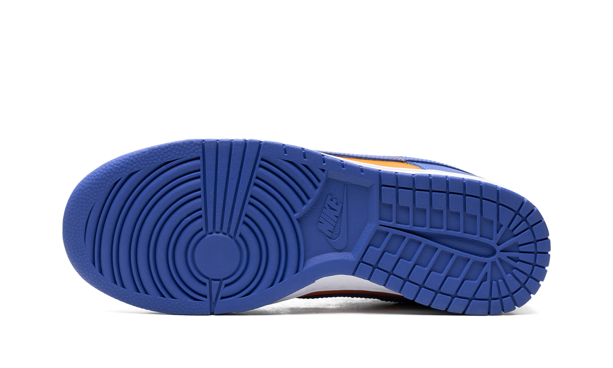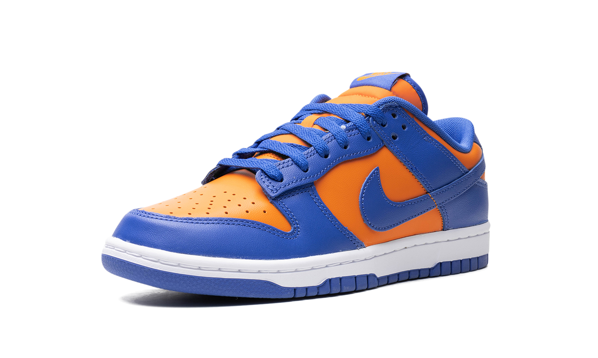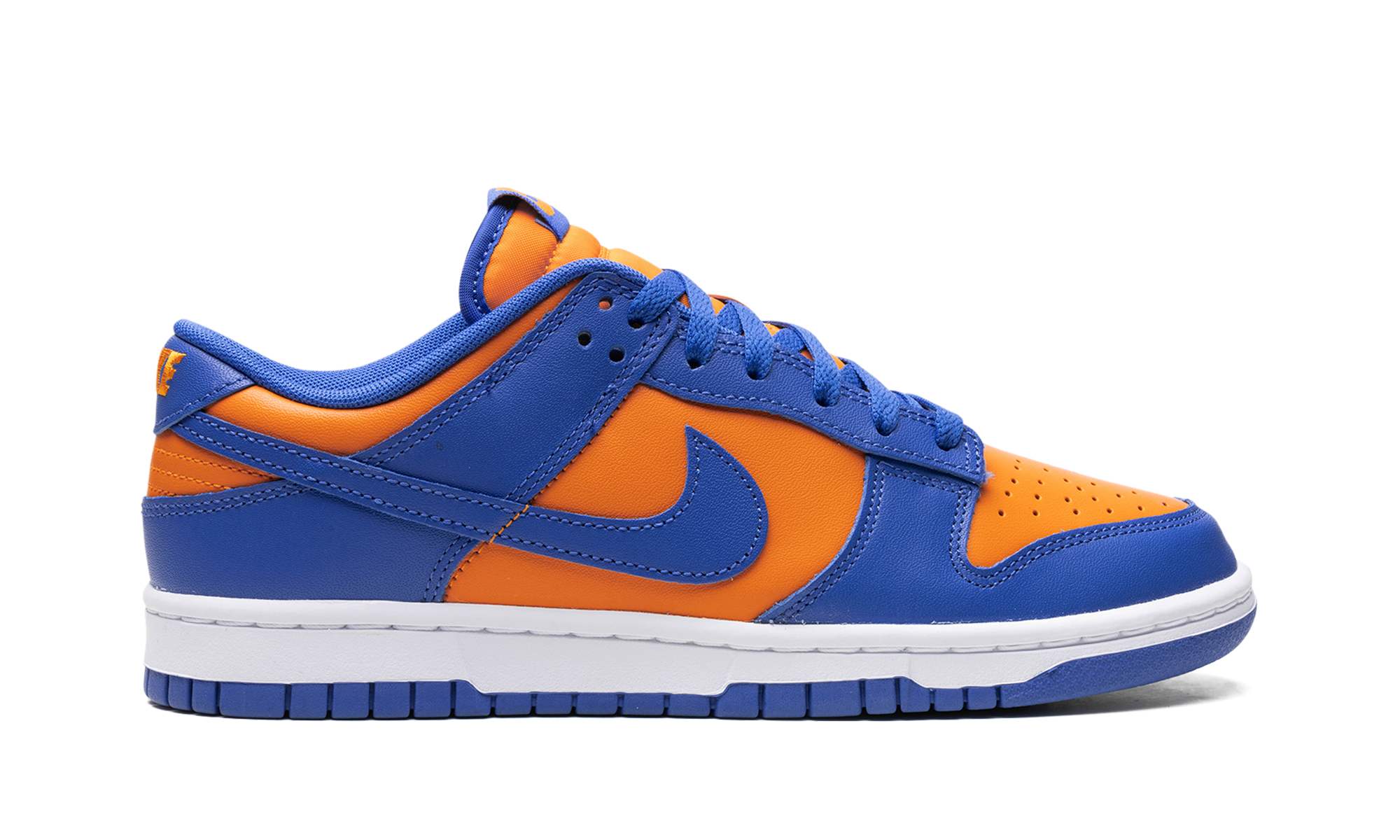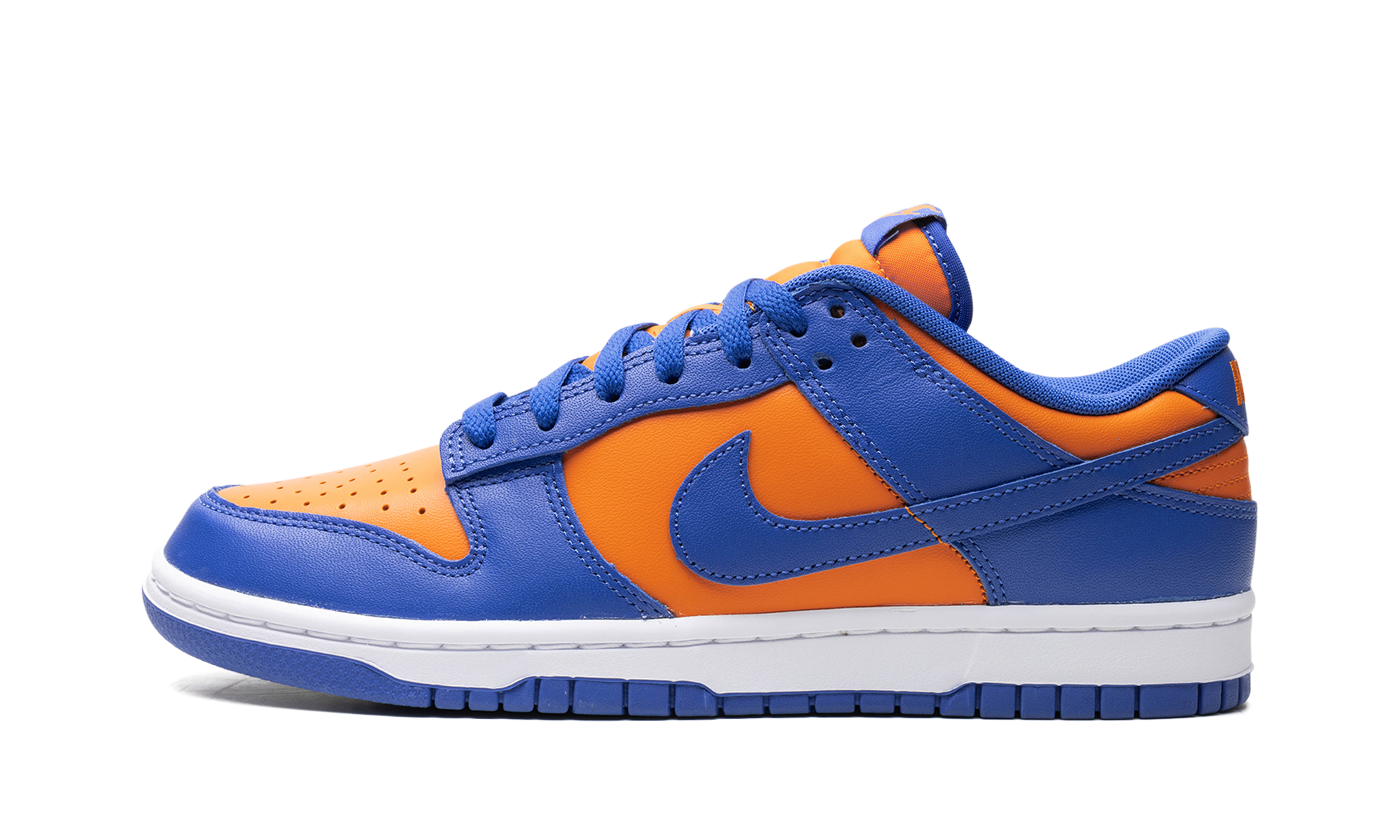 Nike Dunk Low „Knicks” to wariacja na temat butów do koszykówki w stylu retro w barwach New York Knicks. Choć nie są kojarzone z Knicks, model Dunk Low, nazwany na cześć drużyny NBA, nadal wyraża miłość do drużyny dzięki pomarańczowo-niebieskiemu kolorowi, nawiązującemu do barw strojów Knicks. Cholewka ma pomarańczową, skórzaną podstawę z niebieskimi, skórzanymi nakładkami i logo Swoosh. Na pięcie wyszyto napis „Nike”, a na języku widnieją logo „Nike” i Swoosh. Całość dopełnia biała podeszwa środkowa i niebieska podeszwa zewnętrzna. Knicks